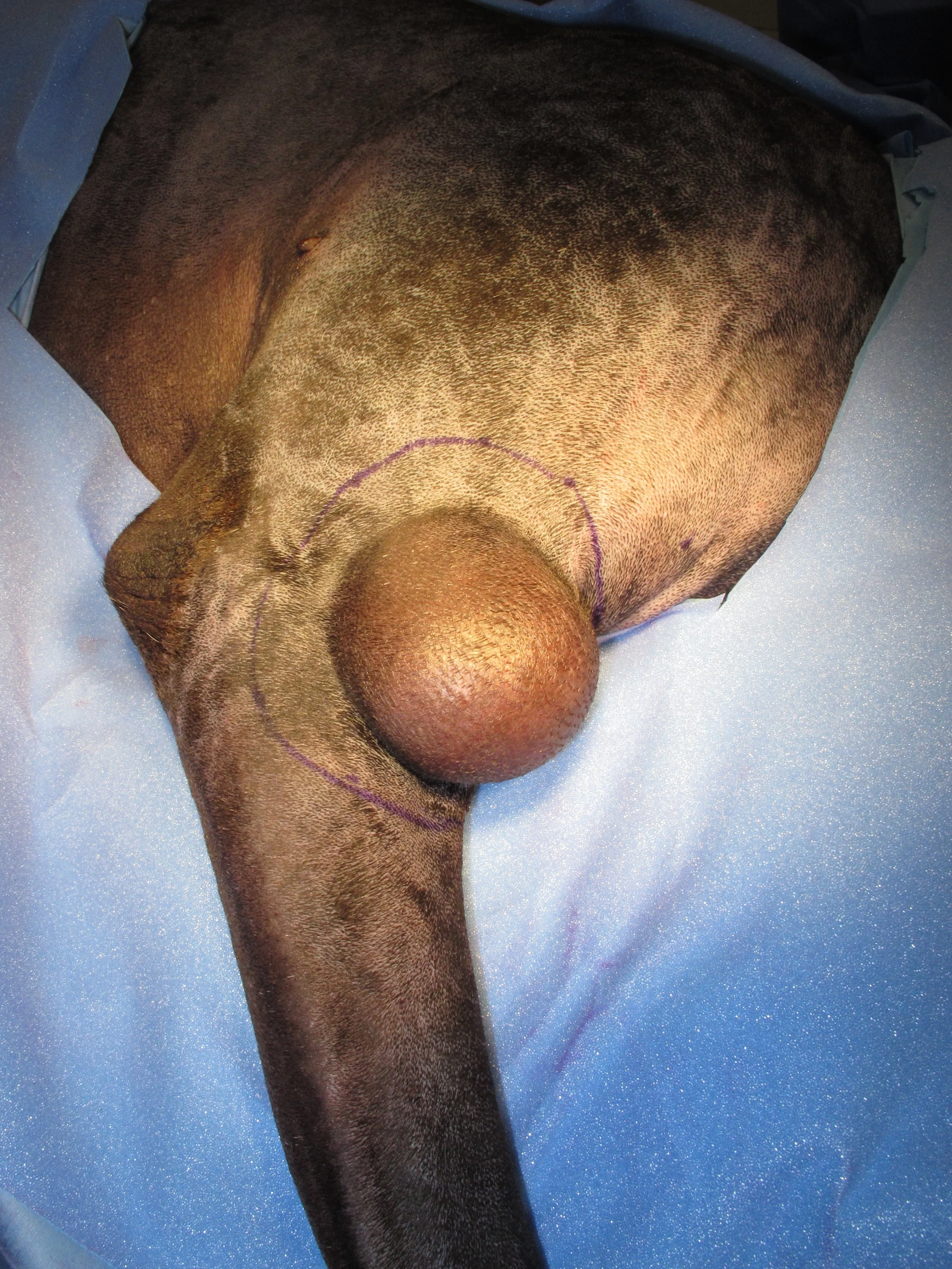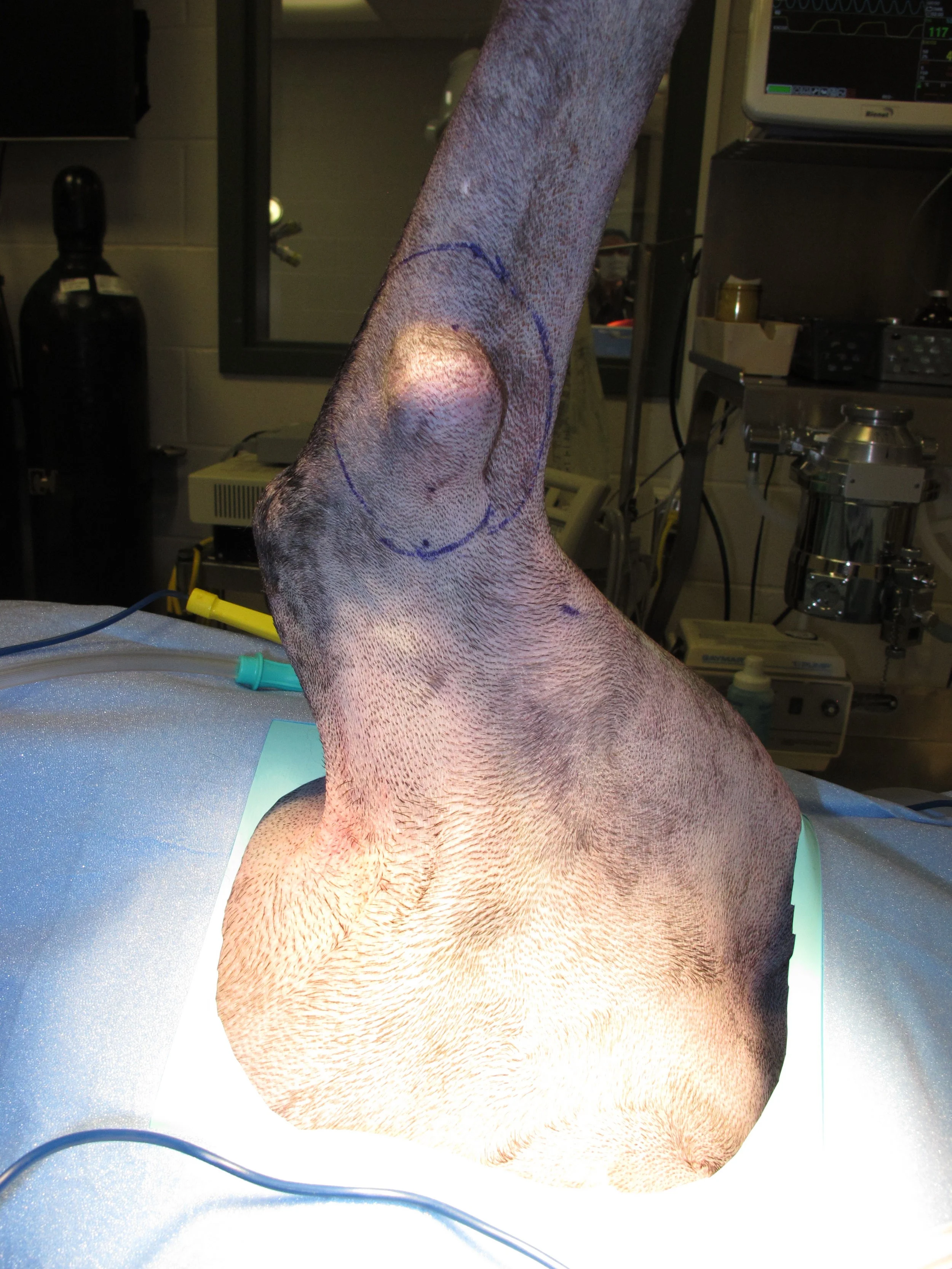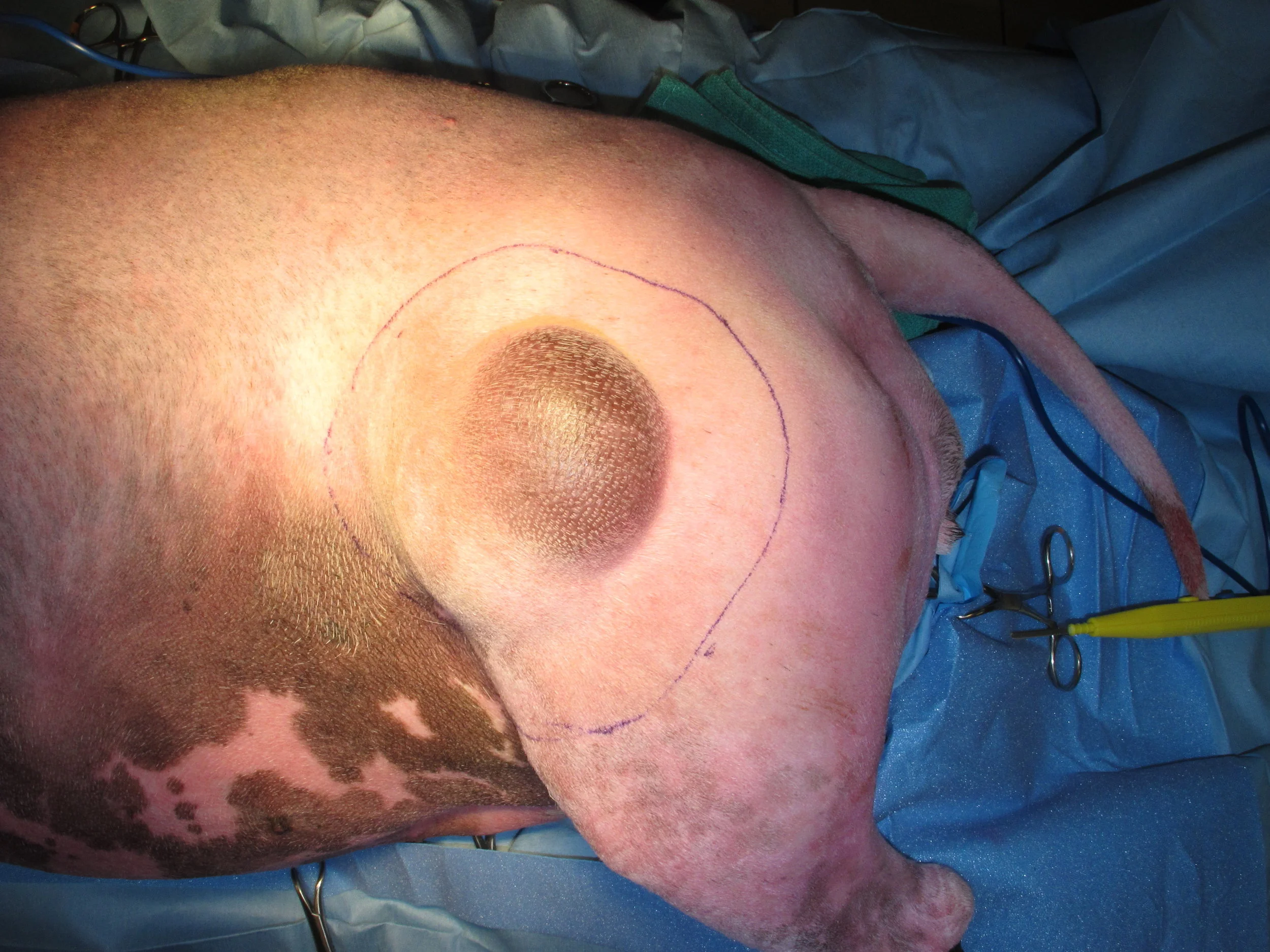 The recommended treatment for STSs is surgical excision. The surgical approach depends on the location (truncal versus extremity), size, degree of invasiveness, and histologic grade. Wide excision (with 3cm lateral margins and one fascial layer for deep margins) is recommended for truncal STSs, grade III STSs, STSs > 5cm, and invasive and fixed STSs. Wide excision of STSs on the limbs and head is often not possible. In these cases, particularly if mobile, well-circumscribed and < 5cm, then marginal excision is possible with low local recurrence rates. In one large study of marginally excised STSs in dogs, the overal local recurrence rates for histologically incompletely excised grade I, II, and III STS were 7%, 34%, and 75%, respectively; and no dog with a completely excised STS developed local recurrence regardless of histologic grade. Historically, radiation therapy has been recommended for incompletely and/or marginally excised STSs and this is often recommended in the treatment of STSs in people, but there is no evidence to support this multimodality therapy in dogs. There is no published study comparing surgery alone to surgery and radiation therapy for dogs with incompletely excised STSs. There have been six studies published on marginal and/or incomplete histologic excision of STSs alone and three studies published on radiation therapy following marginal and/or incomplete histologic excision of STSs. While it is very difficult to compare these studies because of different study criteria, the local recurrence rates varied from 11%-28% and 16%-31% for surgery alone and surgery and radiation therapy, respectively.